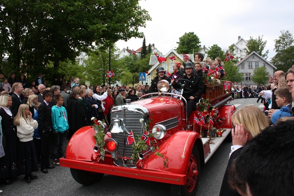 Rundt omkring i landet er det vanlig med brannbiler i 17.mai togene. Det variere litt med om det er gamle brannbiler eller dagens brannbiler som kjører i togene.I Brannvesenet Sør-Rogaland er det både nye brannbiler og veteranbrannbiler. I Stavanger sentrum kjører Peter Pirsch 1938 mod, og den kjører i barnetoget, "Lende" toget og folketoget. Det er brannfolk som er på jobb som kjører. (foto - Stian Magnussen)